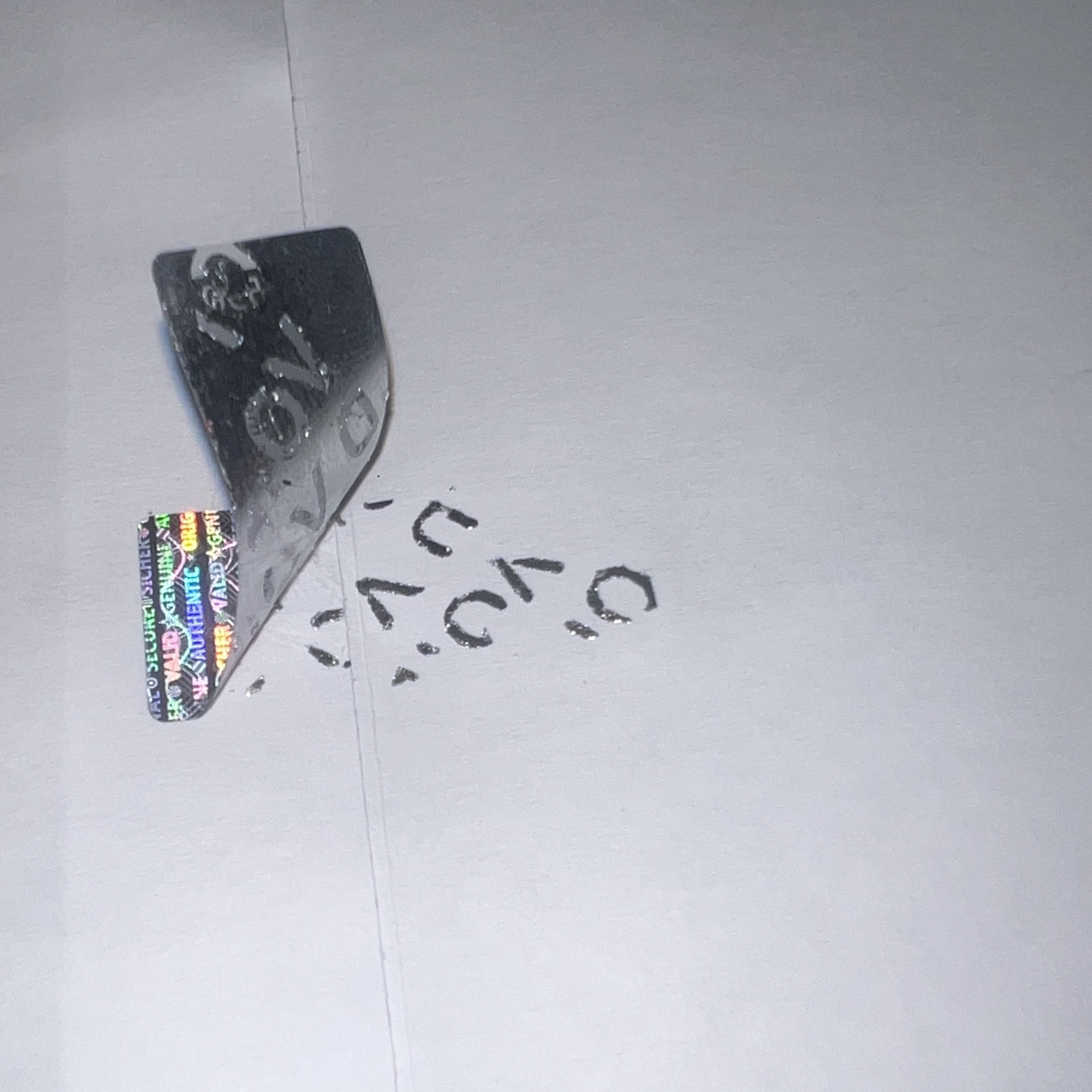 - Im Hologramm-Steifen sind die Wörter "Sicher, Genuine, Valid, Authentic, Original, Secure" mit diversen Mustern und Sicherheitssymbolen vorhanden.