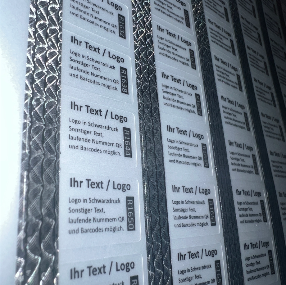 - Der freie Bereich kann nach Ihren Vorgaben frei gestaltet werden. So können Ihr Logo oder Text sowie diverse Barcodes und QR-Codes aufgedruckt werden. Auch Artikelnummern, Seriennummern, laufende Nummern usw. nach Ihren Vorgaben sind möglich.