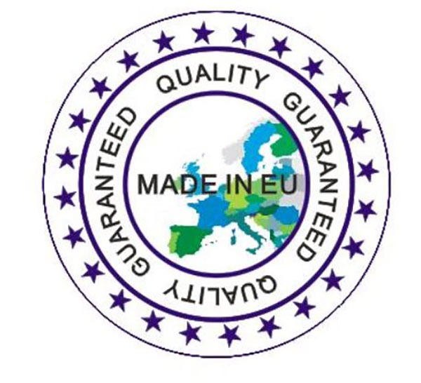 - Aufschrift "Made in EU" "Quality Guaranteed" mit den Umrissen der EU in der Mitte.