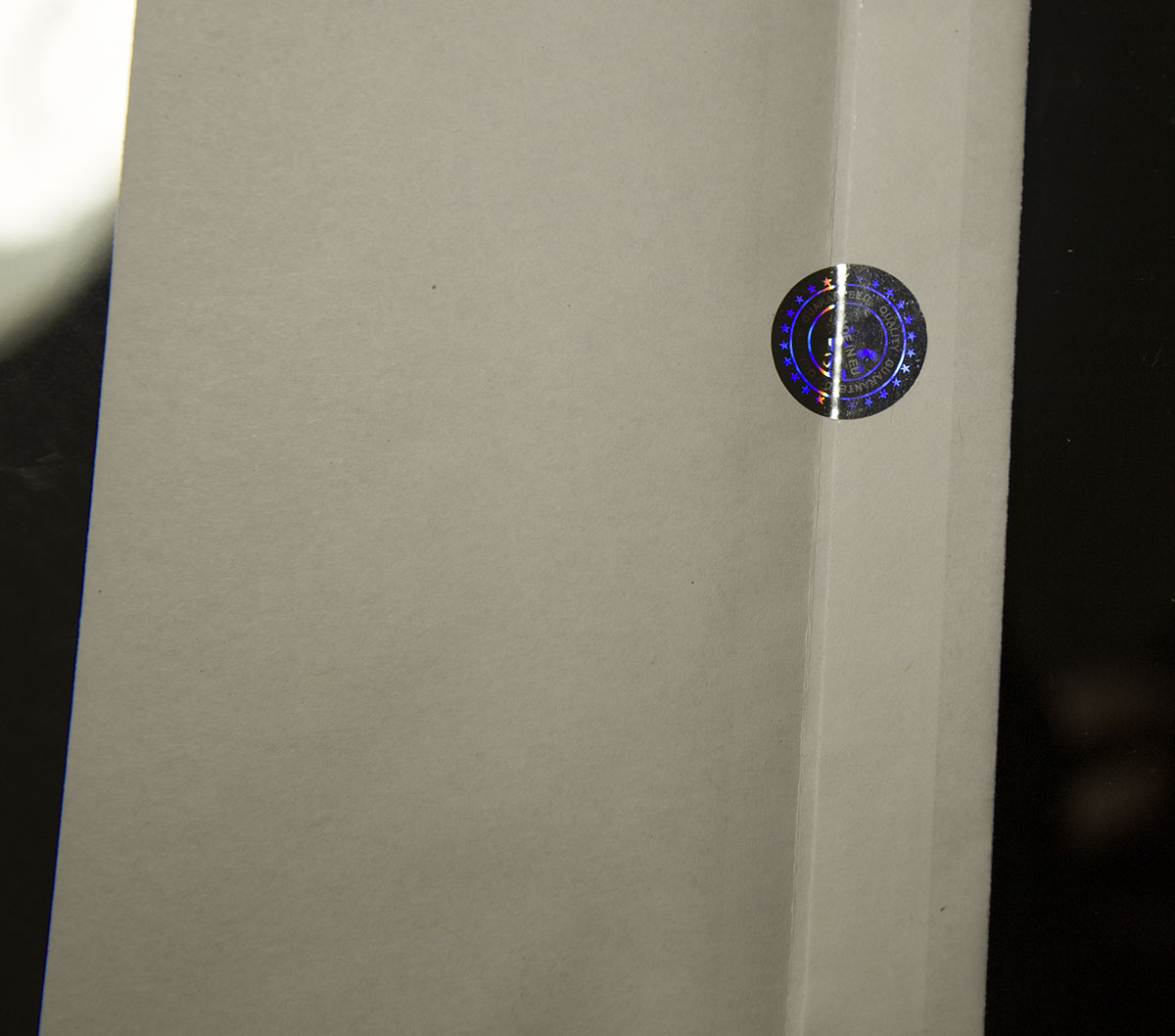 - Je nach Lichteinfall unterschiedlich farbig schillernd (Hologramm-Effekt, ähnlich dem Hologramm auf einem Geldschein).