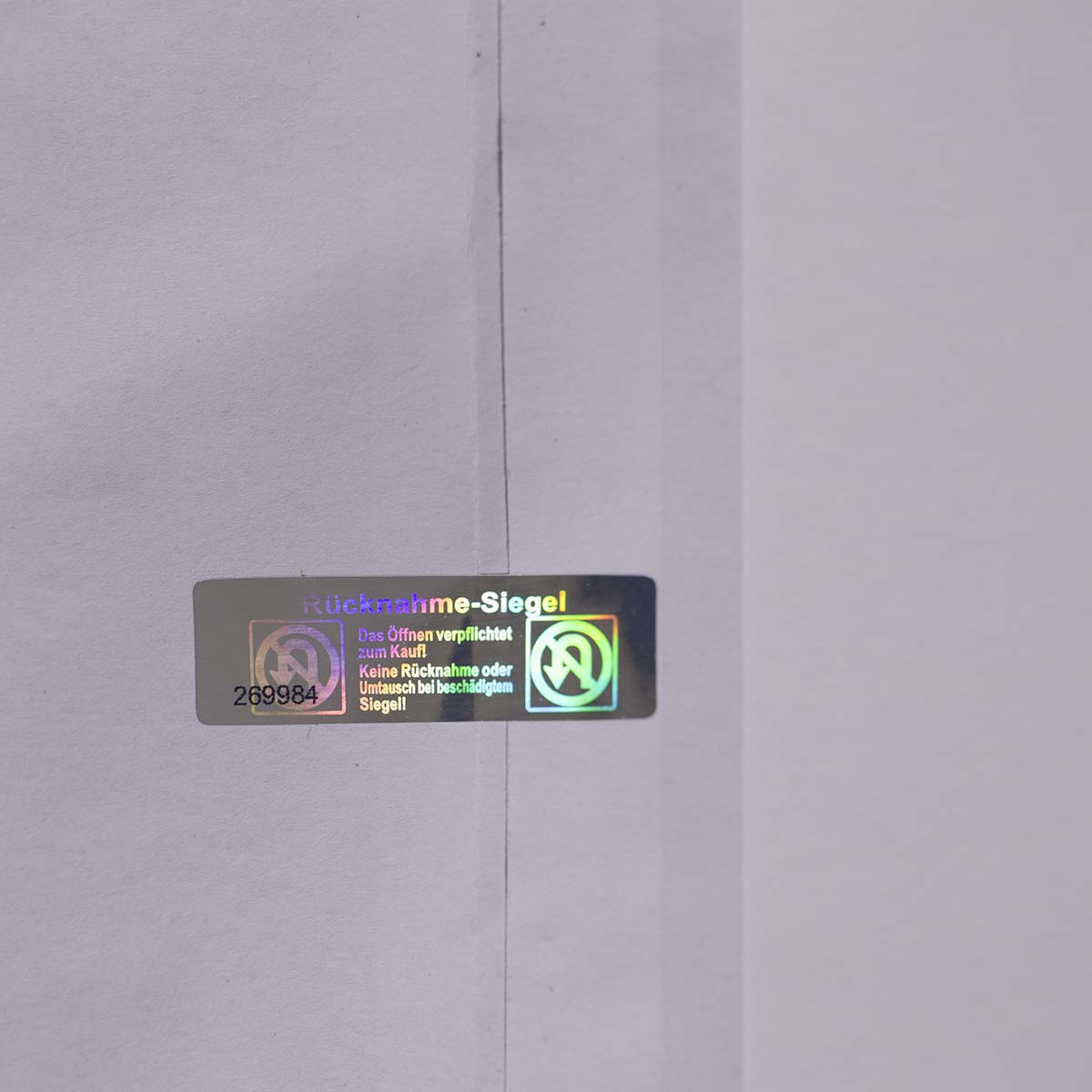 - Aufschrift "Rücknahmesiegel" "Das Öffnen verpflichtet zum Kauf! Keine Rücknahme oder Umtausch bei beschädigtem Siegel!"