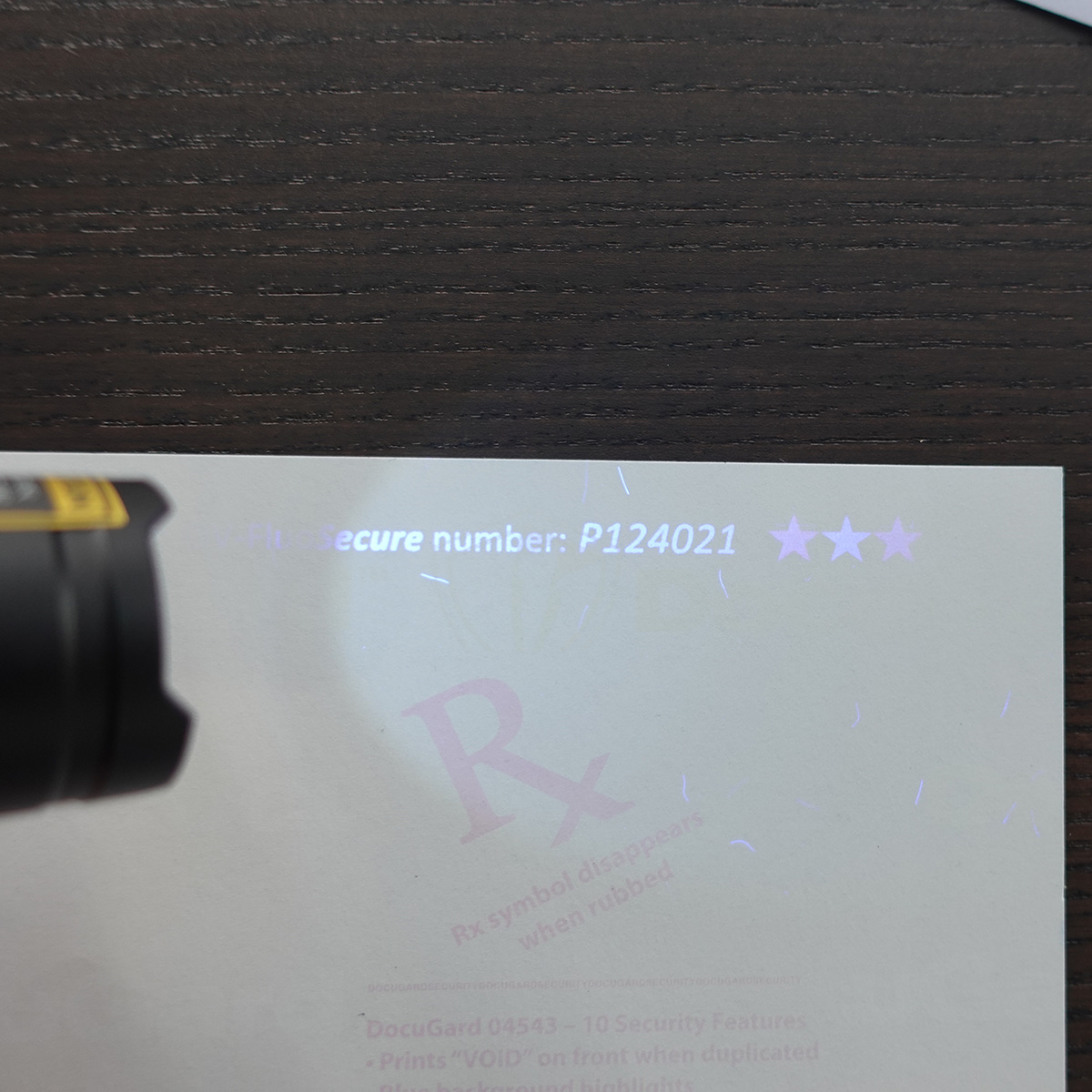 Zusätzlich gesichert durch einmalig vergebene UVFluoSecure Seriennummer. Optional ist das Einbinden Ihres Logos als UV-Druck möglich. (Bitte oben auswählen)