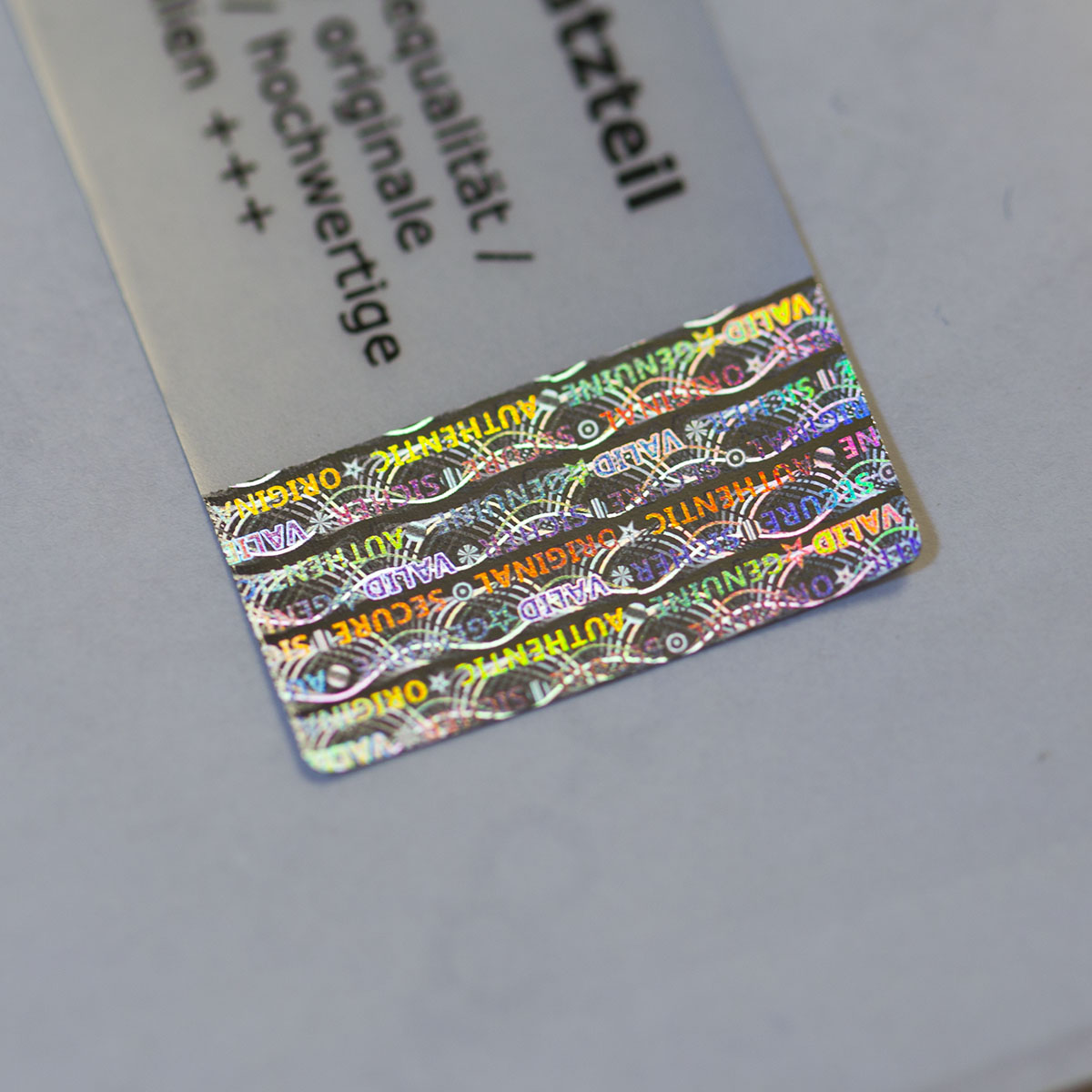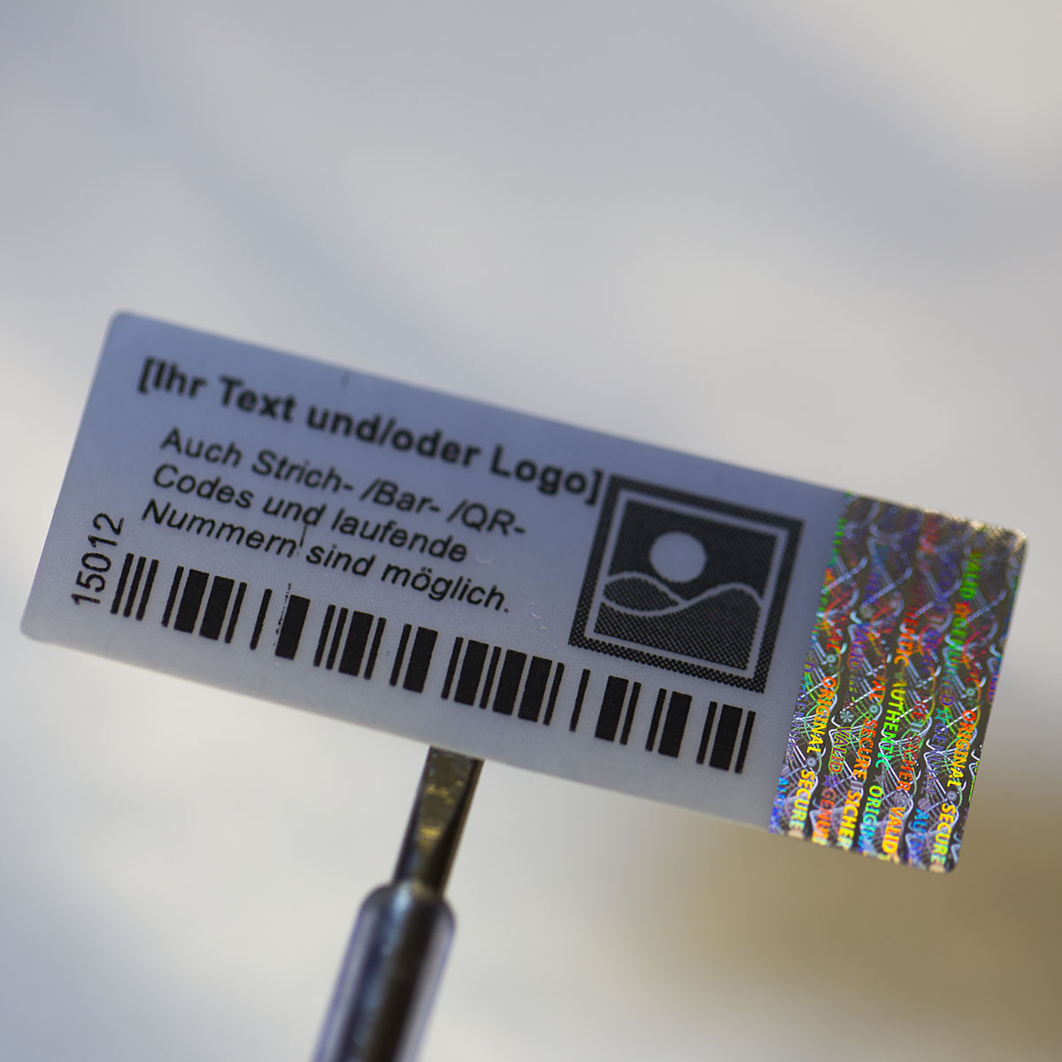Produktinformationen "teil personalisiert - 3D Hologramm Sicherheitssiegel 5 x 2 cm Silber mit schwarzem Druck"