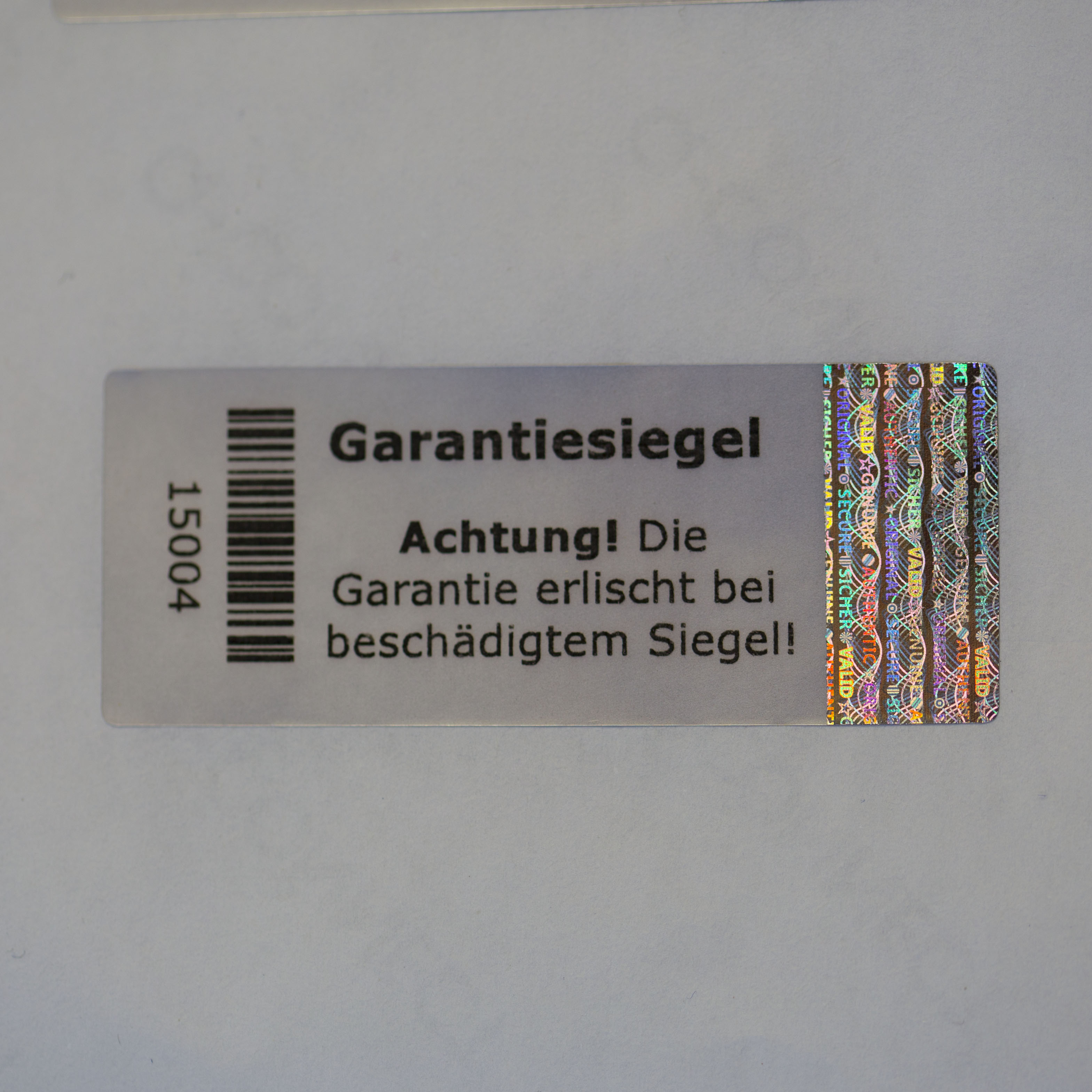 - Text: "Garantiesiegel" "Achtung! Die Garantie erlischt bei beschädigtem Siegel!"