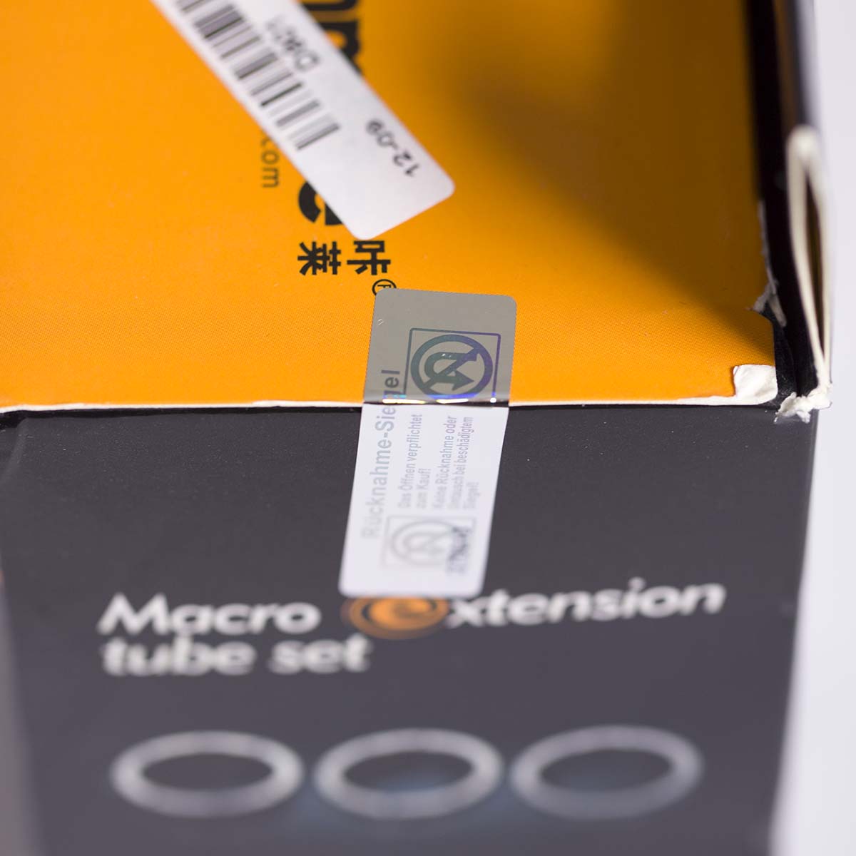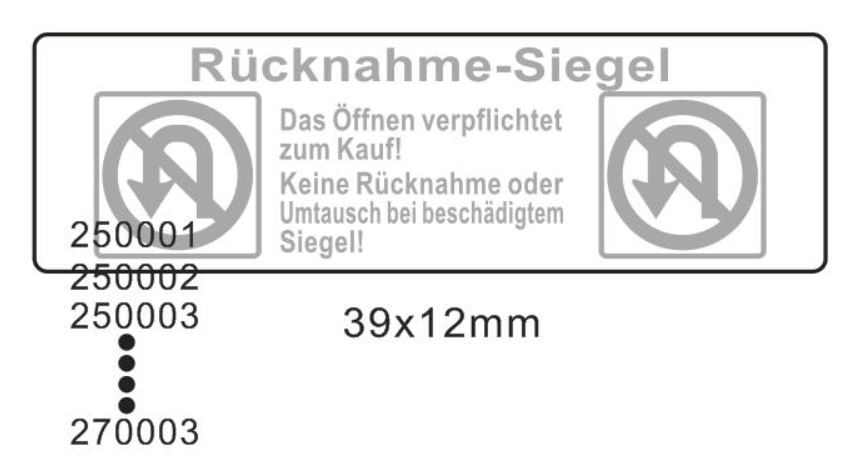 - Aufschrift "Rücknahmesiegel" "Das Öffnen verpflichtet zum Kauf! Keine Rücknahme oder Umtausch bei beschädigtem Siegel!"