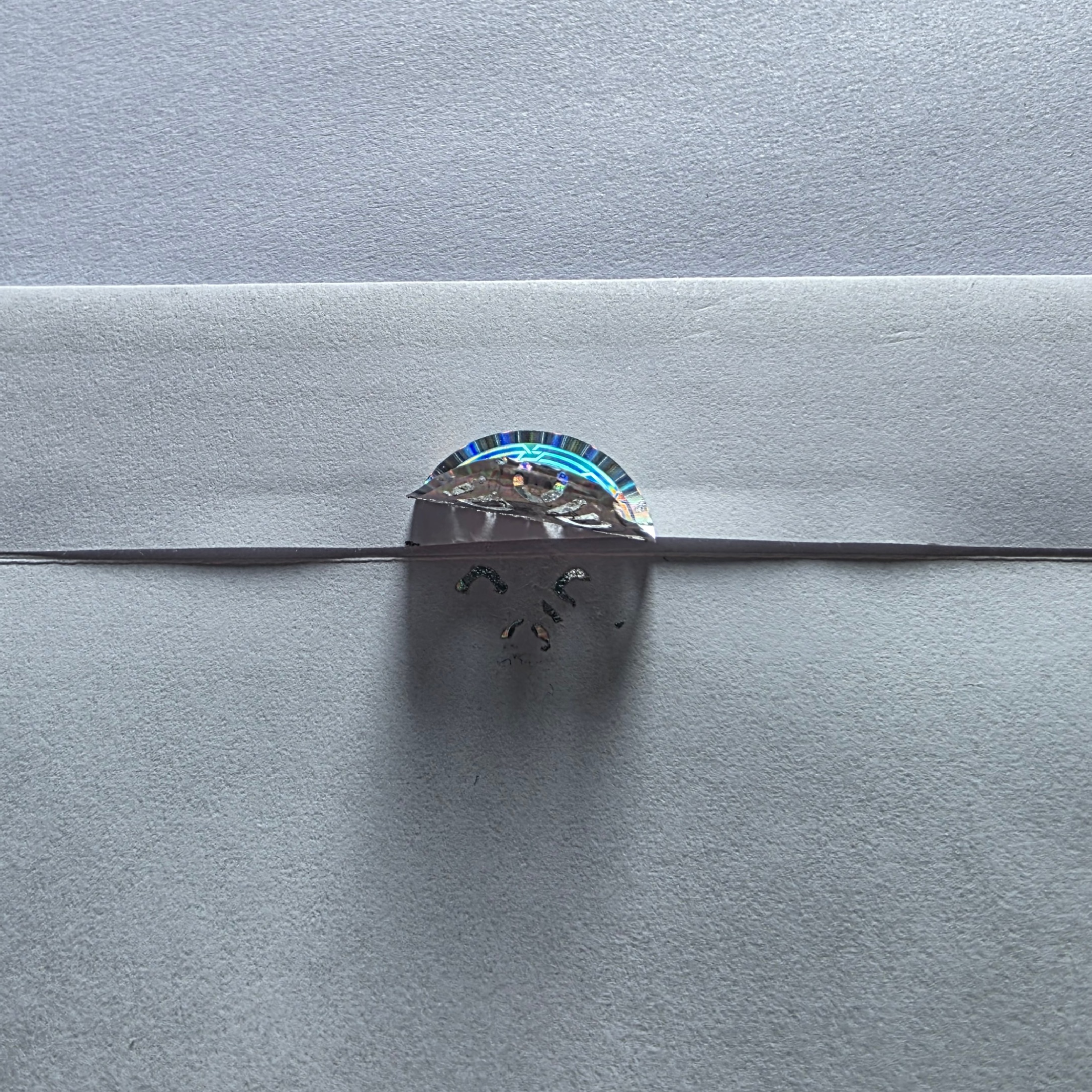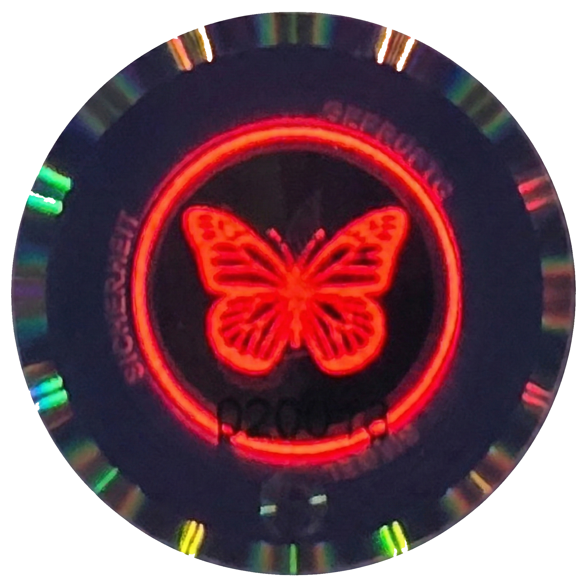 Für das bloße Auge unsichtbar, unter Schwarzlicht (UV-Licht) deutlich sichtbar: Der Schmetterling und der innere Ring leuchten bei Prüfung in intensivem Rot auf. Ein Merkmal, das bei Standard-Siegeln kaum zu finden ist.